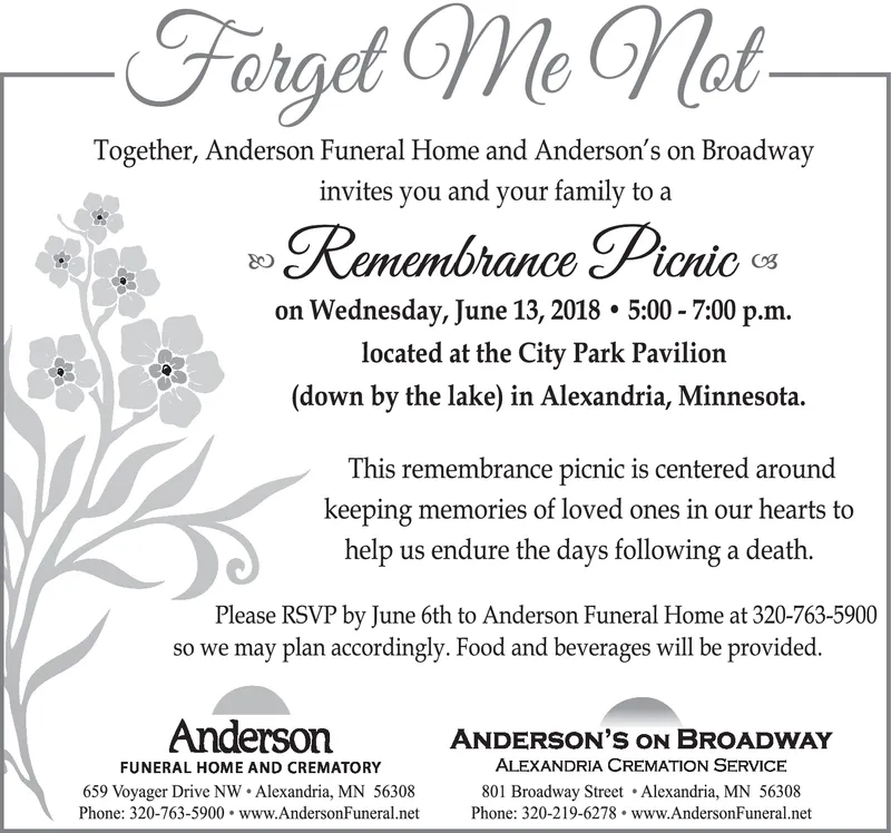 Together, Anderson Funeral Home and Anderson's on Broadway invites vou and vour family to a nembhance Picnic os on Wednesday, June 13, 2018 5:00 -7:00 p.m located at the Citv Park Pavilion (down by the lake) in Alexandria, Minnesota. This remembrance picnic is centered around keeping memories of loved ones in our hearts to help us endure the days following a death. Please RSVP by June 6th to Anderson Funeral Home at 320-763-5900 so we may plan accordingly. Food and beverages will be provided Anderson ANDERSON'S ON BROADWAY ALEXANDRIA CREMATION SERVICE 801 Broadway Street Alexandria, MN 56308 Phone: 320-219-6278 www.AndersonFuneral.net FUNERAL HOME AND CREMATORY 659 Voyager Drive NW Alexandria, MN 56308 Phone: 320-763-5900 www.AndersonFuneral.net