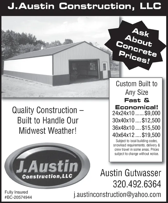 J.Austin Construction, LLC Ask About Concrete Prices! Custom Built to Any Size Fast & Quality Construction Built to Handle Our Economical! 24x24x10.... $9,000 30x40x10... $12,500 $15,500 36x48x10.... 40x64x12.. $19,500 Midwest Weather! Subject to local building codes, snowload requirements, delivery & crew travel in some areas. Prices subject to change without notice. J.Austin Austin Gutwasser 320.492.6364 Construction,LLC Fully Insured #BC-20574944 j.austinconstruction@yahoo.com 001461917r1 J.Austin Construction, LLC Ask About Concrete Prices! Custom Built to Any Size Fast & Quality Construction Built to Handle Our Economical! 24x24x10.... $9,000 30x40x10... $12,500 $15,500 36x48x10.... 40x64x12.. $19,500 Midwest Weather! Subject to local building codes, snowload requirements, delivery & crew travel in some areas. Prices subject to change without notice. J.Austin Austin Gutwasser 320.492.6364 Construction,LLC Fully Insured #BC-20574944 j.austinconstruction@yahoo.com 001461917r1